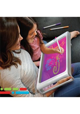 Create colorful doodles that come to life with bright led lights. Six washable markers that interact with light. Place on a table or mount to the wall. Includes drawing templates to get you started and spark creativity. The drawing board is removable for displaying on a table or shelf, or taking on long trips by car or airplane! The drawing board is removable for displaying on a table or shelf, or taking on long trips by car or airplane! 4.1 out of 5 stars. Two pink dry erase crayons. Portable art board goes where you go Unlike traditional easels, this one comes equipped with led lights to make their art truly come alive. This transparent drawing board lets your child make their mark with fluorescent markers, then see it glow with led lights. Board measures 17.5 x 11 x 1 & comes with 6 neon gel markers. Simply secure your paper and template to the tablet with the integrated clip and you're ready to create your own masterpiece!